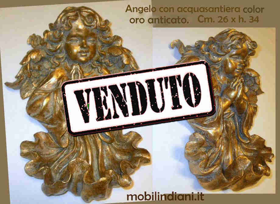 Acquasantiera da parete con putto, realizzata in resina colore oro anticato. Cm.26 h.34 India