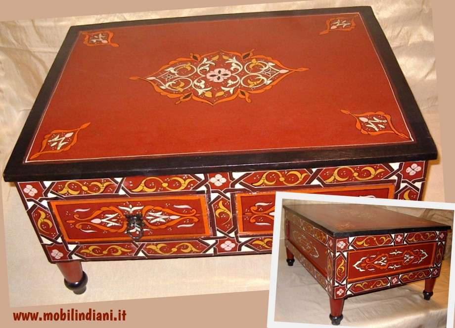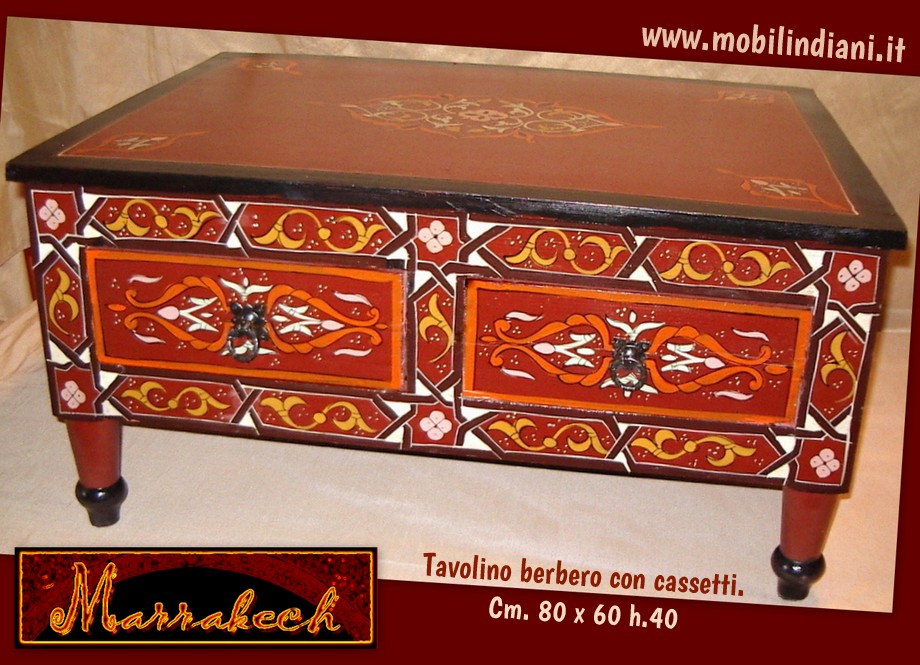 Disponibilità 1PIANO CON QUALCHE SEGNO (vedi foto) Tavolino arabo del Marocco in legno dipinto con due cassetti, dipinto a mano con motivi berberi, colore del fondo rosso mattone. Cm.80x60 h.40 Paese Marrakech, Marocco RITIRO PRESSO NS. SEDE COSTO ZERO. Per info chiedi su WhatsApp o mail: info@mobilindiani.it