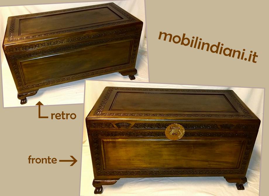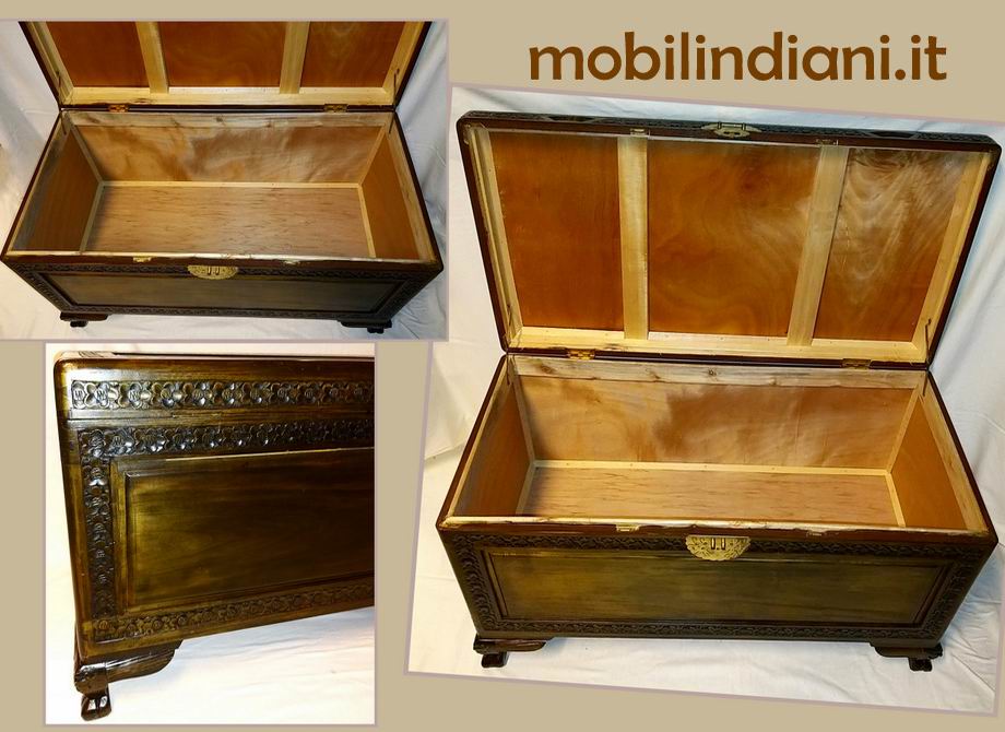 Disponibilità 1Baule in legno di canfora, patina originale. Finemente intagliato su tutti i lati, chiusino in ottone. In origine veniva usato per il trasporto navale di stampati e manoscritti. Oggi, un vero e proprio elemento d'arredo per la vs. casa. Cm.101x53 h.59 Paese Cina PER INFO COSTI SPEDIZIONE CHIEDI su WhatsApp o via mail: info@mobilindiani.it