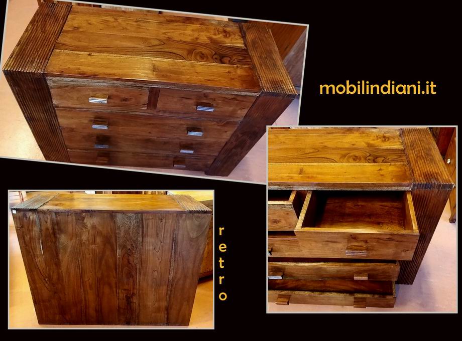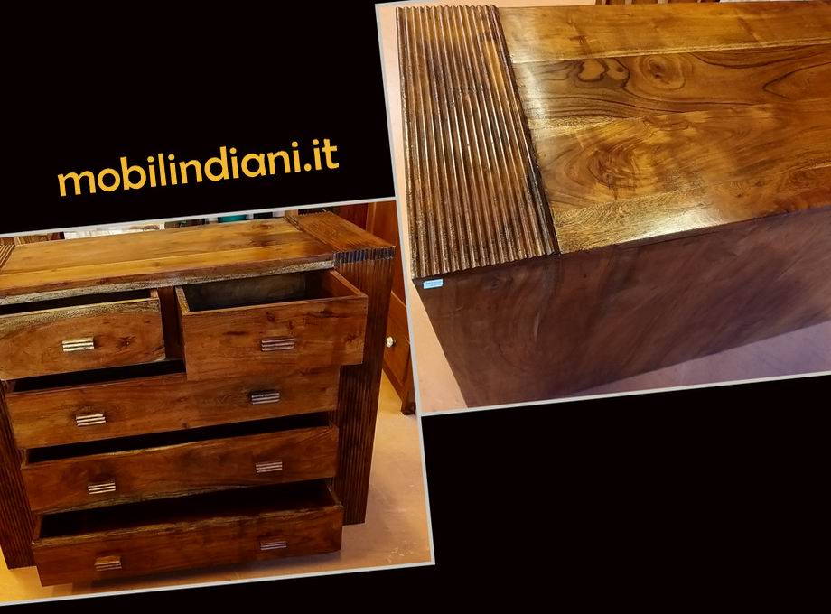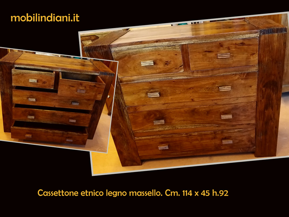 Disponibilità 1Cassettone etnico 5 cassetti, linea essenziale. Legno sheesham massello (noce) Cm.114 prof.45 h.92 Paese India. Disponibili anche 2 comodini stessa linea vedi art.COM-099 Articolo visionabile presso ns. esposizione. PER INFO COSTI SPEDIZIONE CHIEDI su WhatsApp o via mail: info@mobilindiani.it