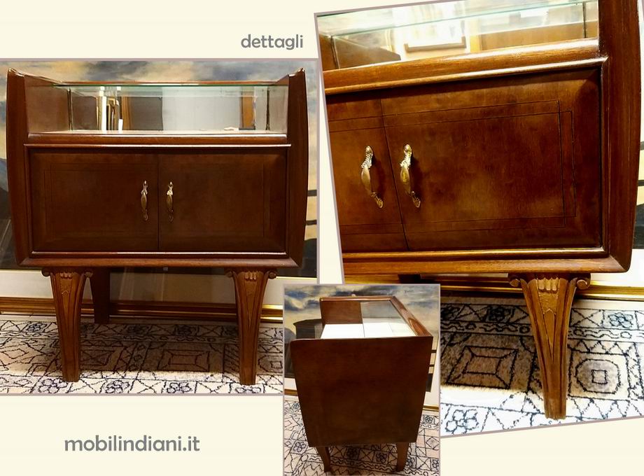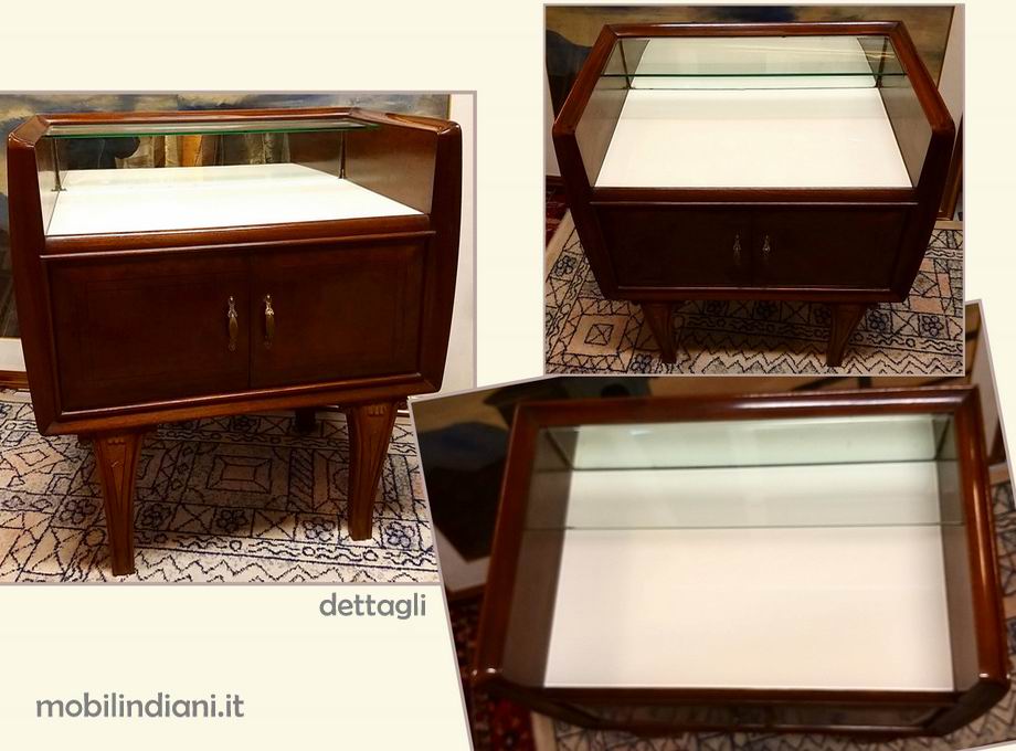 Disponibilità 1Comodino anni '50 originale. Design italiano. Realizzato in radica di noce. gambe intagliate in noce massello. Maniglie in ottone, piano in vetro color panna + piano rialzato (più piccolo) in vetro trasparente + specchio tra i due piani (vedi foto) Struttura sana e robusta, vetri in ottime condizioni. Sullo specchio sono presenti leggeri segni del tempo. Cm. 60x38 h.68 NO SPEDIZIONE - RITIRO PRESSO NS. SEDE COSTO ZERO. Per info chiedi su WhatsApp o mail: info@mobilindiani.it