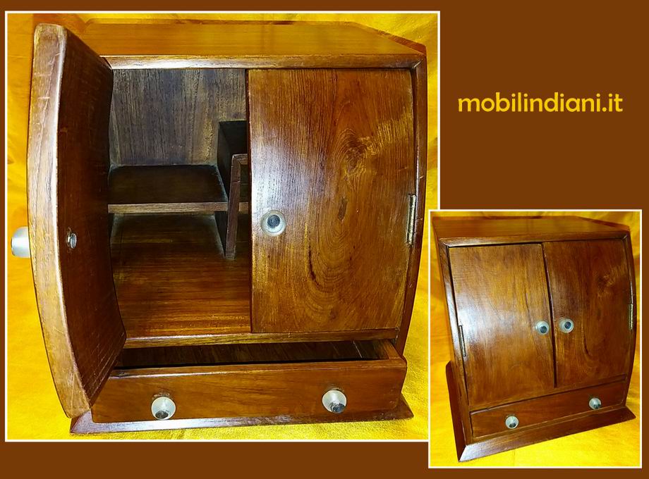Disponibilità 1Particolare mobiletto indiano con antine bombate e cassetto. E' in legno massello di sheesham (noce) dal colore caldo mielato. Le manigliette sono in vetro opale. Cm.largh.30 prof.26 alt.30,5 Paese India. COSTO TRASPORTO €. 29,00 Iva Inclusa. Per costi trasporto Isole, chiedi info su WhatsApp o mail: info@mobilindiani.it