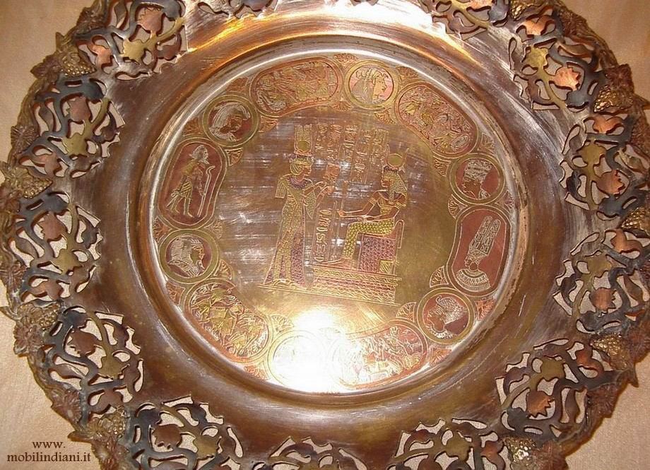 Piatto egiziano in rame inciso e dipinto a mano, motivi Antico Egitto. Periodo primi del '900. Diam. cm.50 h.6 - Peso Kg.2,100/ca. In Egitto Il primo metallo ad essere lavorato fu il rame, riuscendo anche a colorarlo con pigmenti di origine sintetica. COSTO TRASPORTO €. 17,93 iva inclusa. Per trasporto Isole invia mail a info@mobilindiani.it