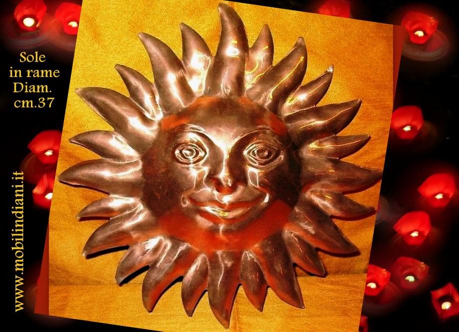 Disponibilità 1Oggettistica etnica in rame. Sole etnico da appendere a parete, materiale rame. Diam. cm.37 Paese India. COSTO TRASPORTO €. 8,80 Iva Inclusa. Per costi trasporto Isole, chiedi info su WhatsApp o mail: info@mobilindiani.it