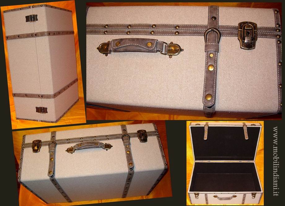 Valigia stile vintage da interno, in legno rivestito in tessuto color corda e in tessuto nero internamente. Impreziosita da cinghie in ecocuoio e rivetti color bronzo. Ganci di chiusura a chiavistello. IDEALE PER LA BIANCHERIA. Cm.67x46 h.27 Paese Francia. COSTO TRASPORTO €. 35,38 iva inclusa. Per trasporto Isole invia mail a info@mobilindiani.it